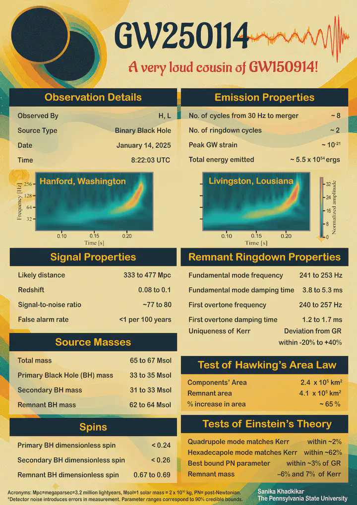 GW250114 is a loud binary black hole merger detected by LIGO on January 14, 2025, marking ten years of gravitational wave astronomy. The factsheet covers its observation details, signal properties, source masses, spins, and tests of general relativity including measurements of the Hawking area law. Featured on the official LIGO detection page.