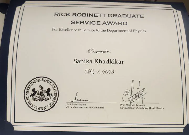 Awarded the Rick Robinett Student Service Award by the Penn State Department of Physics in recognition of contributions to the graduate student community through mentorship, outreach, and departmental service.